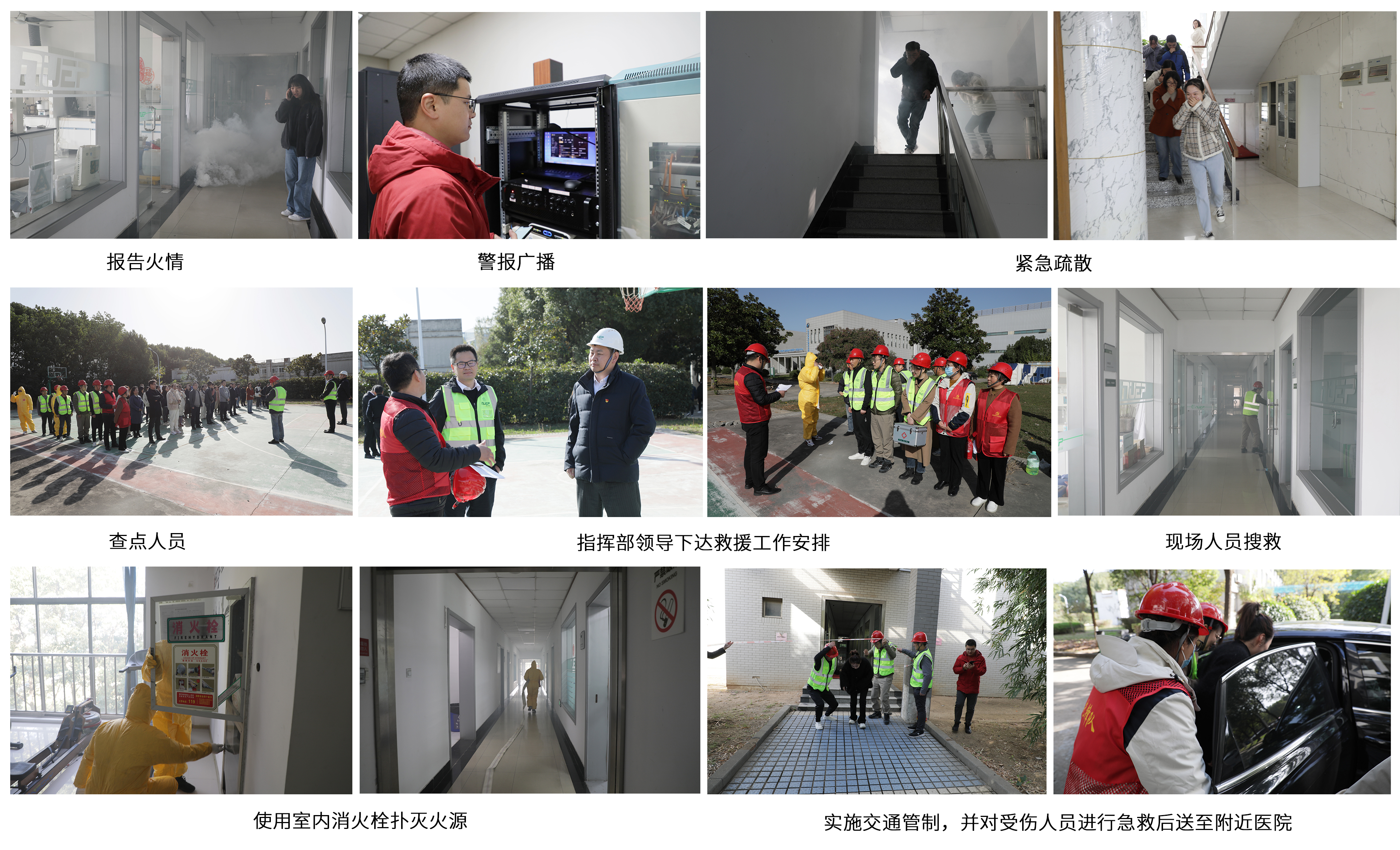 上午9:30分,模擬辦公樓三層實(shí)驗(yàn)室突發(fā)火情,火災(zāi)呈現(xiàn)蔓延趨勢,接到險情報告后,指揮部迅速啟動應(yīng)急預(yù)案,各應(yīng)急小組從火警廣播、人員疏散、人員救援、火災(zāi)撲救等全流程、全環(huán)節(jié)進(jìn)行“模擬實(shí)戰(zhàn)”。9點(diǎn)32分,各部門人員按照疏散路線、采用合理動作有序撤離辦公樓并在指定安全地點(diǎn)集結(jié);9點(diǎn)33分,應(yīng)急隊伍緊急集合完畢,并進(jìn)入現(xiàn)場開展交通警戒、人員搜救和火災(zāi)撲救等行動;9:45分,現(xiàn)場火勢撲滅,應(yīng)急隊伍返回集結(jié)點(diǎn)并向指揮部匯報應(yīng)急救援結(jié)果。