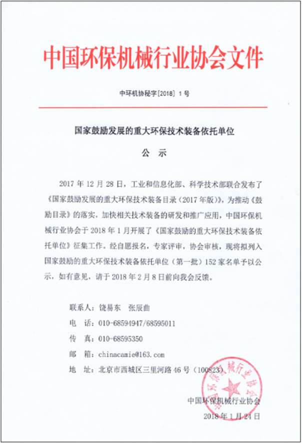 2017年12月28日,工業和信息化部、科學技術部聯合發布了《國家鼓勵發展的重大環保技術裝備目錄(2017年版)》,我司“連續吸附再生水處理裝備“入選該目錄。為推動《鼓勵目錄》落實,加快相關技術裝備的研發和推廣應用,中國環保機械行業協會于2018年1月開展了《國家鼓勵發展的重大環保技術裝備依托單位》征集工作。我司積極組織策劃,開展相關申報工作。最終,我司憑借技術優勢,入選國家鼓勵發展的重大環保技術裝備依托單位(http://www.bjcamie.org.cn)。