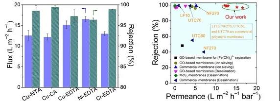 膜分離技術是水處理領域最為常用的技術之一,作為一類新型的高性能膜材料,二維分離膜層間距的精確調控是提高其水通量與截留效率的關鍵,而插層法是最為有效的調控方法。迄今,高性能納米級插層劑的開發與應用仍是巨大的挑戰,目前最為常用的硬物質插層劑(如碳納米管、TiO?和SiO?納米顆粒等)分散性較差,且易破壞二維膜的有序層狀結構,造成亞納米尺寸離子的快速穿透;一些小分子插層劑如乙二胺或金屬離子易與膜層形成強相互作用,導致層間距較窄,水通量較低。 針對上述問題,張煒銘、潘丙才教授課題組借鑒納米仿生思路,首次提出通過軟物質插層劑構建類似水通道蛋白通道的新策略。研究以實現污廢水中重金屬絡合物的高效分離與水質凈化為最終目標,首先制備出聚丙烯腈凝膠軟粒子(PAN GPs,1-8nm)作為氧化石墨烯(GO)膜的納米級插層劑,通過控制GO膜層間PAN GPs形變、溶脹以及PAN GPs-π作用實現了亞納米尺度的層間距離精確調控,與此同時GO膜規整的層狀結構得以充分保留。此外,通過堿性處理可在PAN GPs表面產生電荷和雙疏水/親水性,有機融合了水通道截留性與水的快速滲透,成功構建出類似水通道/蛋白通道結構。研究結果表明,該GO復合膜可截留96%以上的重金屬絡合離子(Cu-NTA、Cu-CA、Cu-EDTA、Ni-EDTA、Cr-EDTA),水通量是文獻報道同類膜的4-13倍。這一研究深入探究了納米級軟顆粒插層劑與氧化石墨烯薄片之間的相互作用及其高水通和高截留的限域分離構效機制,提出的軟顆粒插層策略有望成為設計和研制高性能水處理二維復合膜的新方向。 上述研究成果以 “Soft Particles Enable Fast and Selective Water Transport through Graphene Oxide Membranes”(軟體顆粒插層強化氧化石墨烯膜水通量和選擇性)為題于2020年9月2日發表在美國化學學會期刊 Nano Letters 上(DOI:10.1021/acs.nanolett.0c02724)。論文通訊作者為張煒銘教授和張文彬副研究員,潘丙才教授為共同作者。研究得到了國家重點研發計劃、國家杰出青年基金等項目資助,以及污染控制與資源化研究國家重點實驗室、南京大學環境納米技術研究中心、南京大學高性能計算中心等平臺的大力支持。 圖1 聚丙烯腈凝膠粒子插層制備GO復合膜示意圖 圖2 GO復合膜內納米仿生水通道及層間距離調控示意圖 圖3 GO復合膜水通和截留性能探索·收獲!環境學院張煒銘/潘丙才課題組在氧化石墨烯膜限域分離策略及其水處理應用方面取得新進展